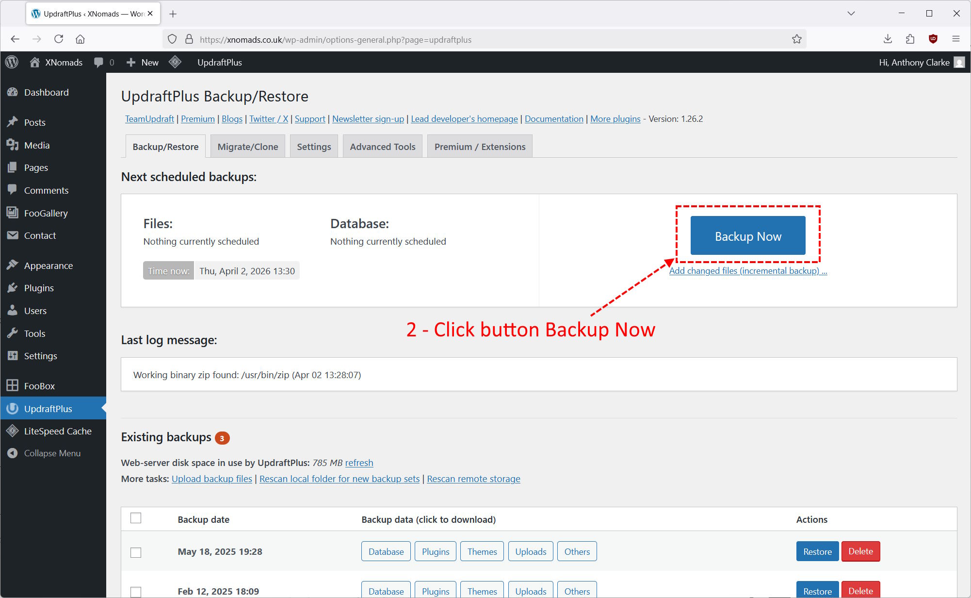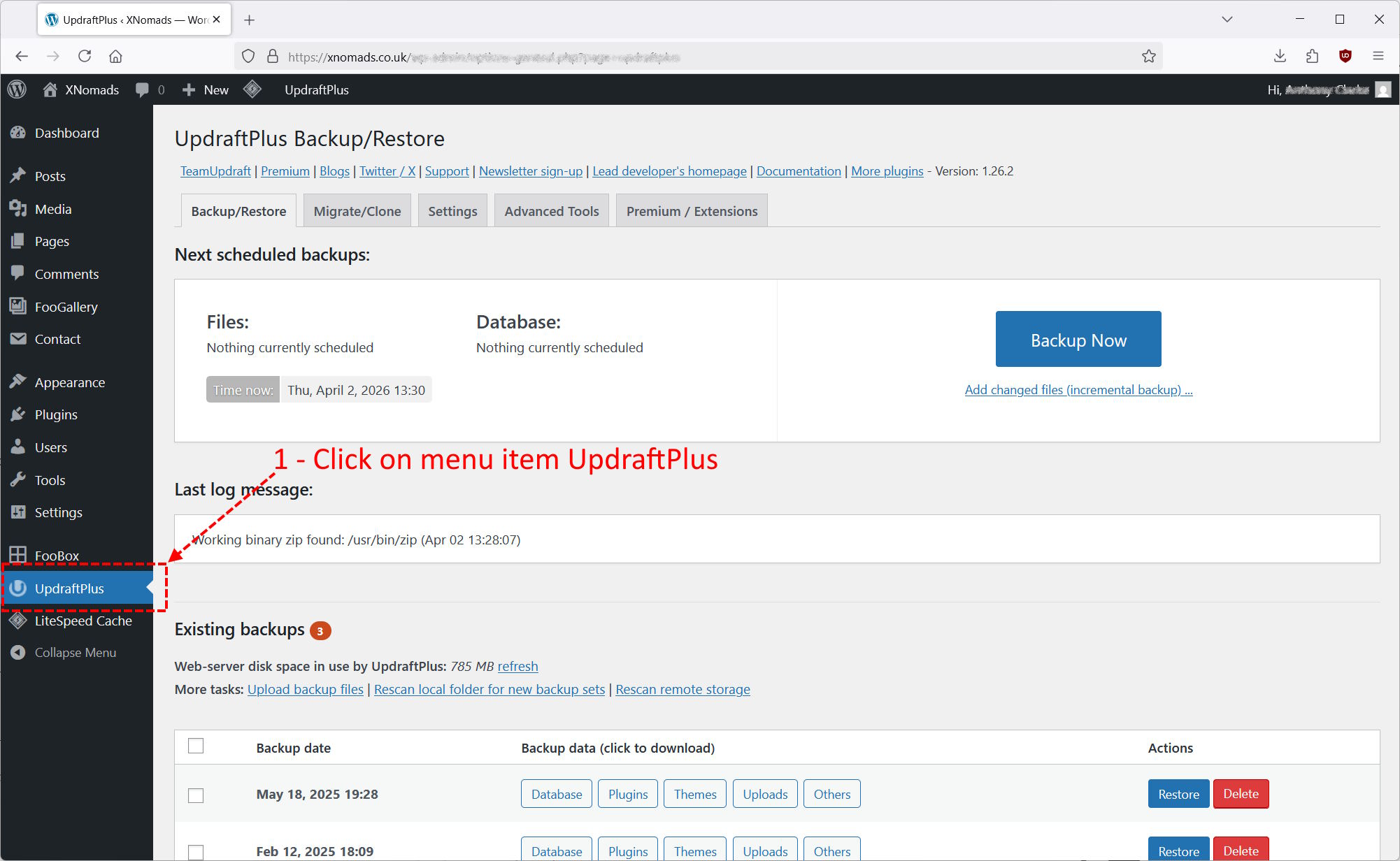 You will need to be logged into WordPress and viewing the dashboard. Down the left hand side, click on UpdraftPlus.