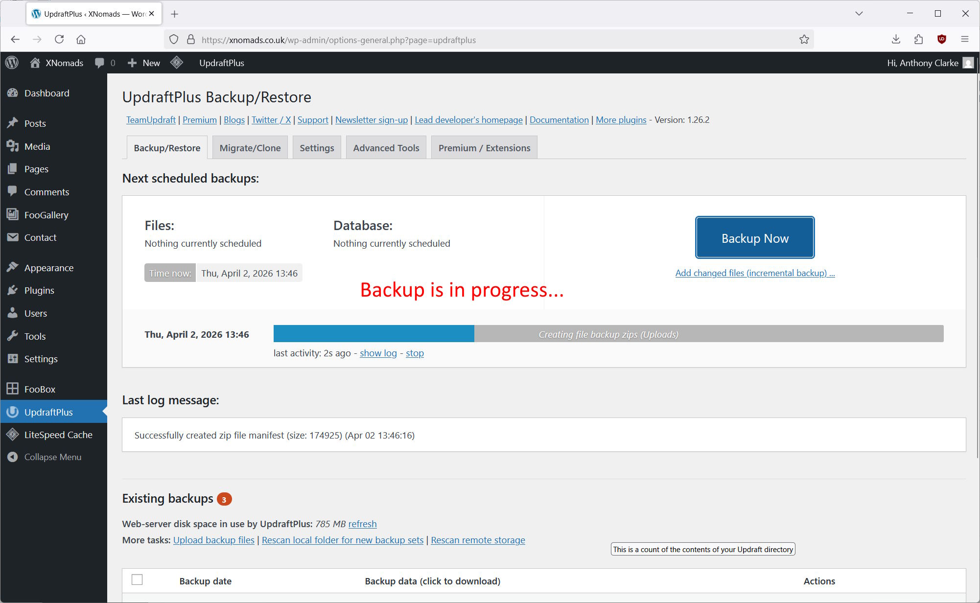 A progress bar will appear whilst the backup is done. The backup may take some time to complete depending on the size of your website.